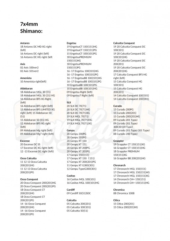 | Größe | Daiwa, Abu Garcia, Quantum, Shimano (8x5mm), Daiwa. Abu Garcia. Quantum. Shimano (8x5mm), Shimano, 13 Fishing (7x4mm), Shimano. 13 Fishing (7x4mm) |